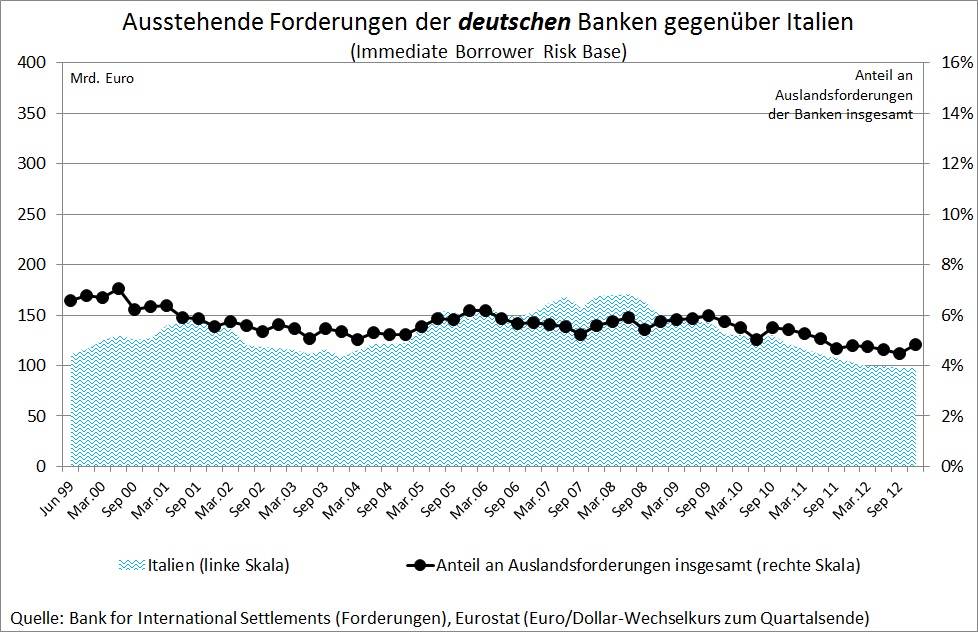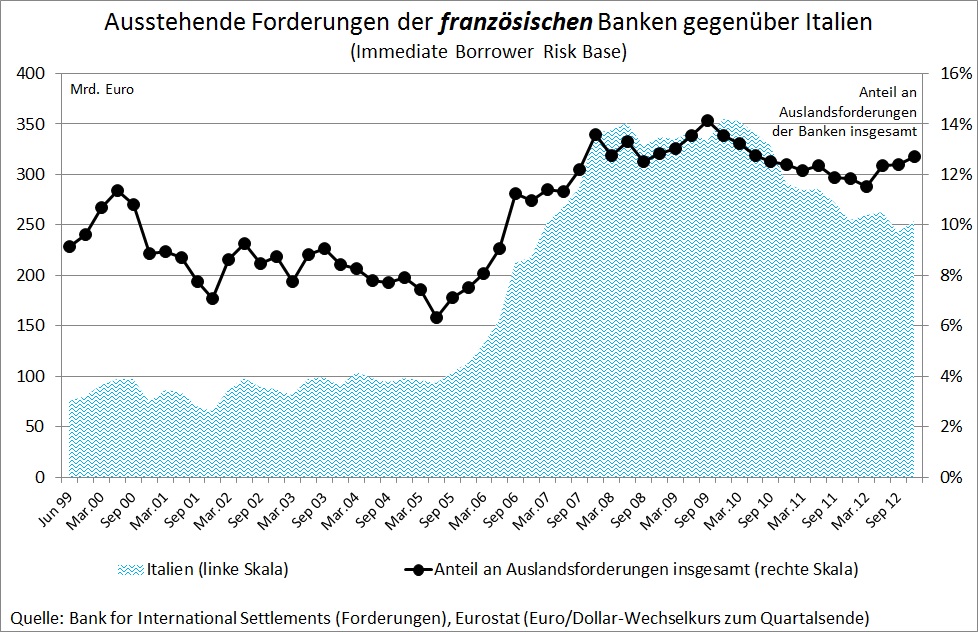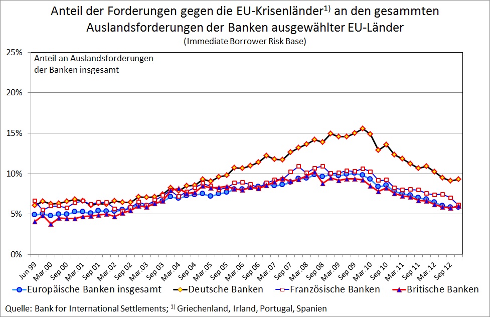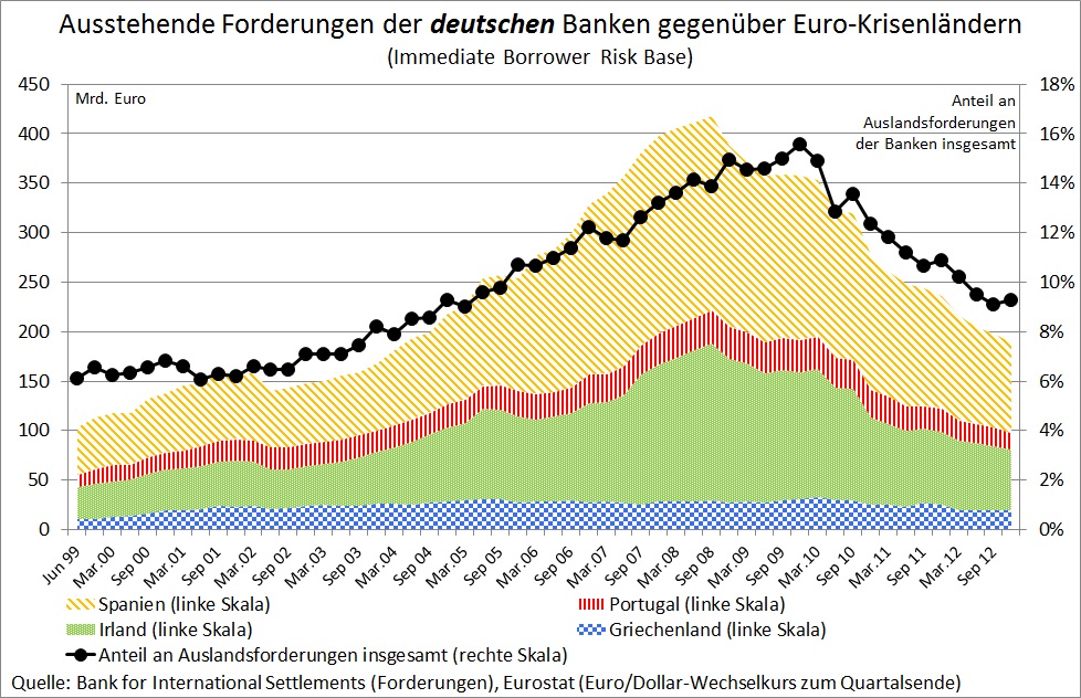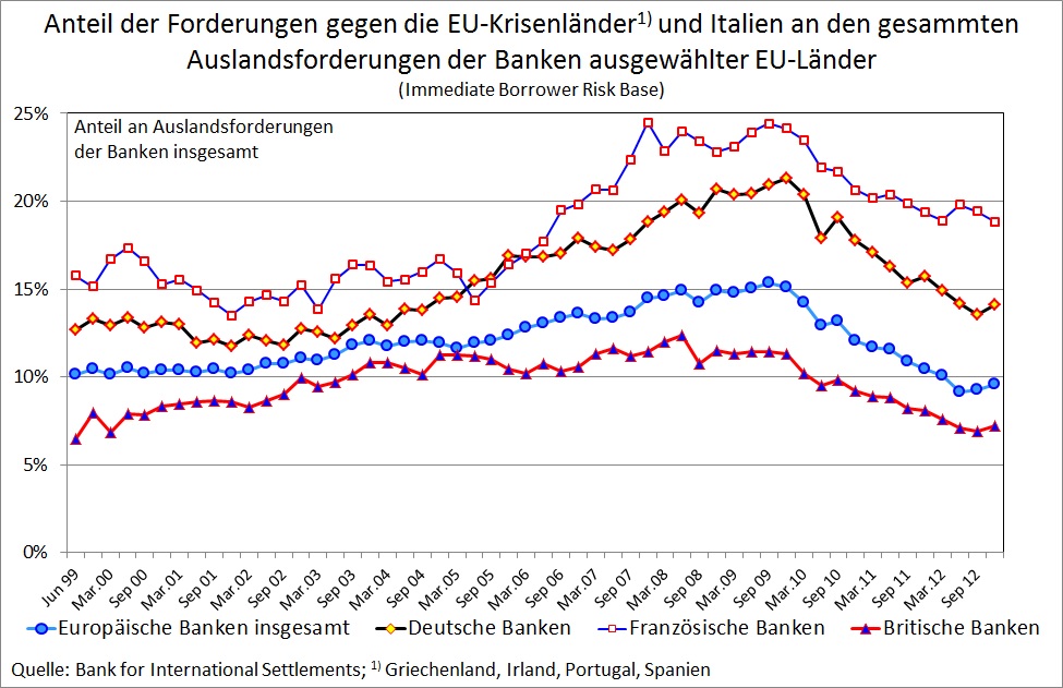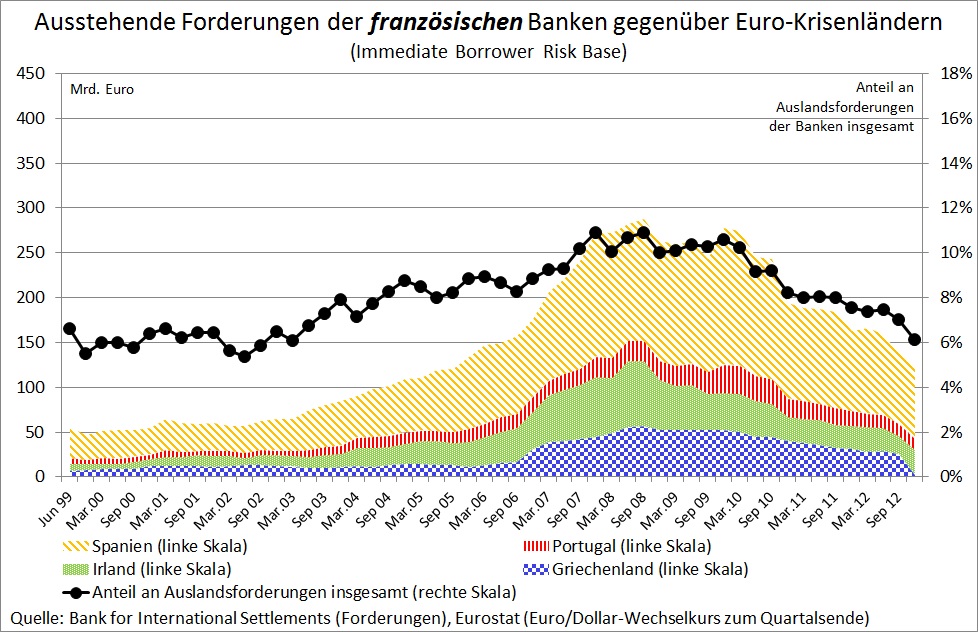 Neben dem verschwörerischen Treiben „der EU“ spielten nach Sinn „französische Banken“ eine zentrale Rolle beim Abfluss von Krediten aus Deutschland in die Krisenländer: „Diese Investoren waren an erster Stelle französische Banken, die sich das Geld dafür großenteils in Deutschland geliehen hatten, aber auch deutsche und britische Banken sowie Anleger aus aller Welt.“ Auch auf den Seiten 4, 6, 15 kommt Sinn immer wieder auf die besondere Rolle der „französischen Banken“ zurück. Vergleicht man jedoch die Entwicklung der Forderungsbestände des französischen Bankensektors mit der anderer Länder, so ist der Befund weit aus weniger eindeutig. Abbildung 2 zeigt die Forderungen deutscher und französischer Banken gegenüber den Krisenländern Griechenland, Irland, Portugal und Spanien. Die Daten stammen von der Bank für internationalen Zahlungsausgleich, auf die sich auch Sinn bezieht. Sie zeigen, dass deutsche Banken sowohl absolut (linke Skala) als auch in Relation zu ihrer Gesamtkreditvergabe (rechte Skala) deutlich mehr Kredite in diese Länder vergeben haben als französische Banken. Das Bild ändert sich erst, wenn man auch Italien hinzuzählt. Hier begannen von Anfang 2006 bis Anfang 2008 französische Banken ihre Kreditvergabe stark zu erhöhen, während sich die Kreditvergabe deutscher Banken kaum veränderte. Nicht für jeden wird aus diesem empirischen Befund ersichtlich, dass französische Banken die Hauptrolle beim Entstehen der Kreditblase in den Krisenländern spielten.
