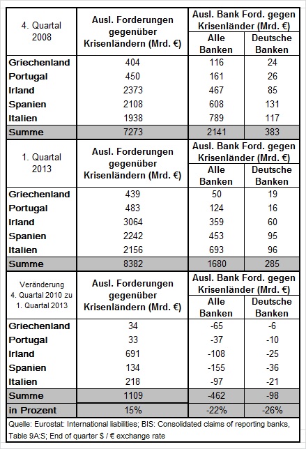 Durch die Absenkung der Besicherungsstandards für die von den Geschäftsbanken zu hinterlegenden Sicherheiten für EZB-Kredite resultiert ein Verlustrisiko für die EZB. Normalerweise werden solche wirtschaftspolitischen Eingriffe mit einer Kosten-Nutzen-Analyse bewertet. Dabei werden den zu erwartenden Kosten des Eingriffs der zu erwartete Nutzen gegenübergestellt. Eigentümlicher Weise befasst sich das ifo-Gutachten nur mit den Kosten. Wie sinnvoll ist das? Der potentielle Nutzen aus der Absenkung der Besicherungsstandards resultiert aus der Vermeidung des Bankrotts privater Geschäftsbanken in den Krisenländern und den davon ausgehenden Kettenreaktionen, die alle Mitgliedsländer in eine schwere Wirtschaftskrise stürzen könnten. Abbildung 10 zeigt die Forderungen des Auslands gegenüber den Krisenländern (nach Eurostat) sowie die Forderungen aller ausländischen Banken (nach BIS) gegenüber den Krisenländern. Die Tabelle gibt die ausländischen Bruttoforderungen gegenüber den Krisenländern an. Ein Saldierung mit den ausländischen Verbindlichkeiten wäre nicht sehr sinnvoll, da bei einem Bankrott zwar die Forderungen gegenüber dem Bankrotteur ausfallen, nicht notwendigerweise aber auch die Verbindlichkeiten. Wie die Tabelle zeigt, sind die Größenordnungen, um die es hier geht beträchtlich. Allein die Forderungen der Banken gegenüber den Krisenländern betrugen im Jahr 2008 mehr als 2000 Mrd. Euro – rund dem Zehnfachen des Forderungsausfalls, den der Lehman Brothers Bankrott verursacht hat.