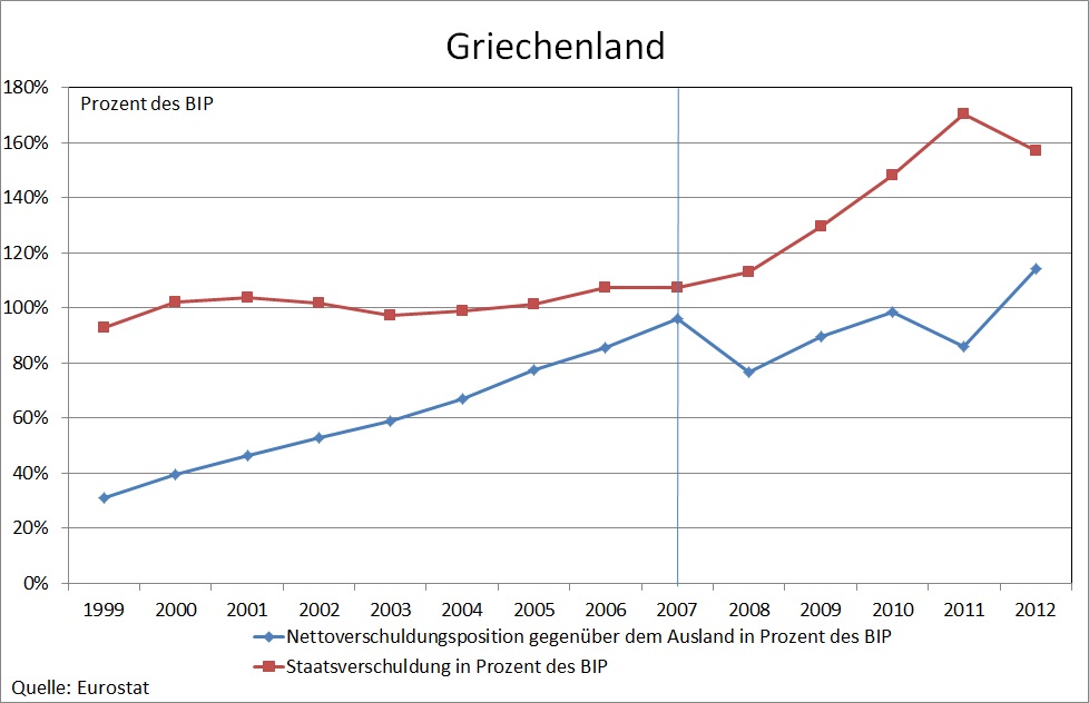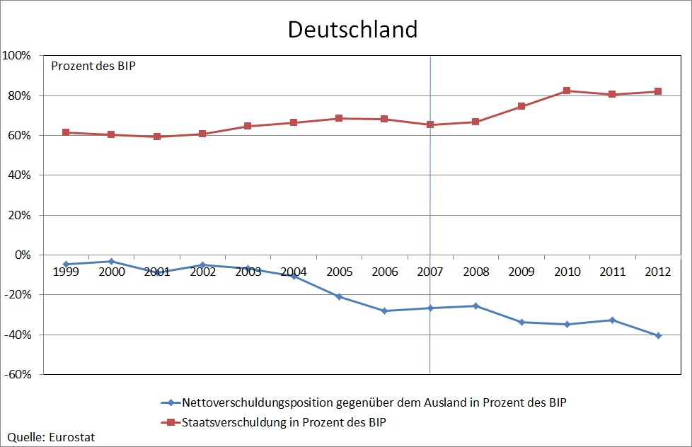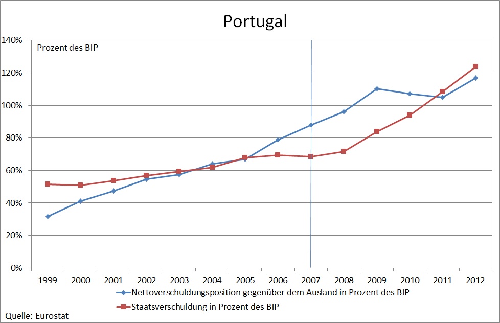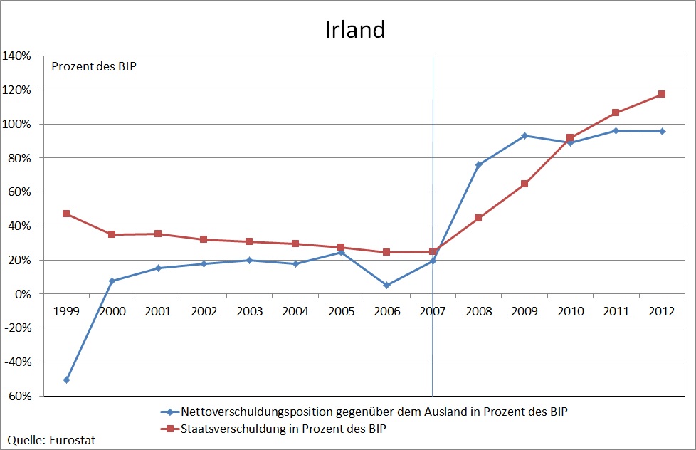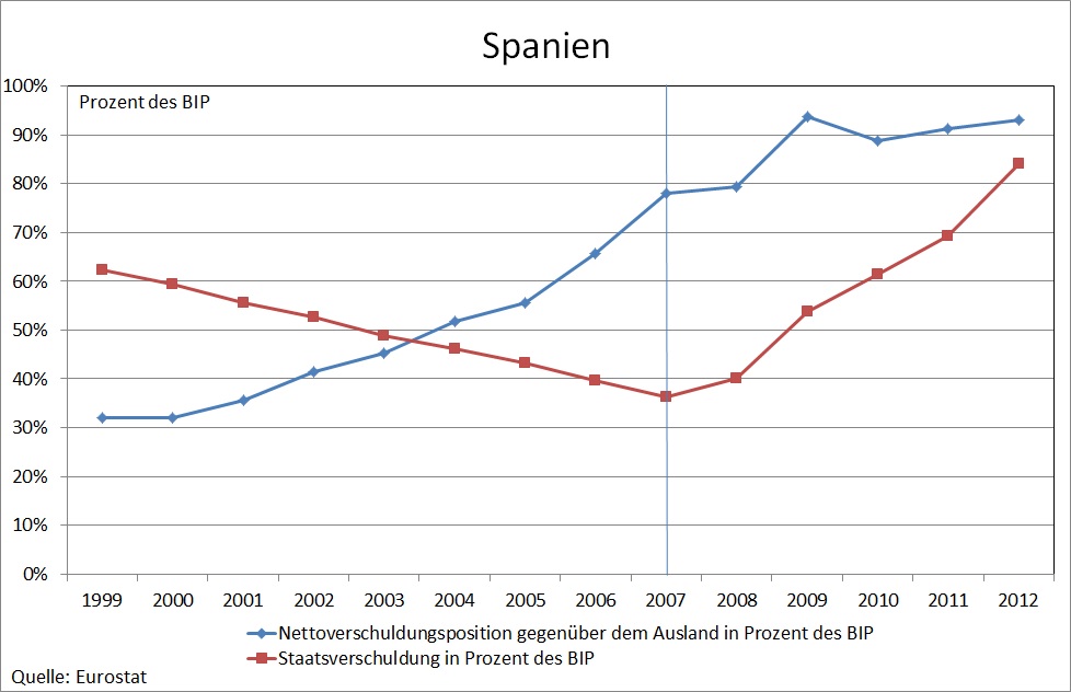 Doch selbst wenn man einmal unterstellt, dass „die EU“ für die niedrige Risikogewichtung von Staatsanleihen im Baseler Abkommen verantwortlich wäre, zeigt die tatsächliche Entwicklung der Staatsverschuldung der Eurokrisenländer, dass darin nicht die Ursache der Krise liegen kann. Zwar stiegen die Staatsverschuldungsquoten vom Beginn der Währungsunion bis zum Ausbruch der Subprimekrise im Jahr 2007 in Griechenland von 92% auf 107% und in Portugal von 51% auf 68%. Sie sanken allerdings in Spanien von 62% auf 36% und in Irland von 47% auf 25%. Die Tatsache, dass Spanien und Irland trotz rückläufiger und vorbildlich niedriger Staatsverschuldungsquoten in eine Verschuldungskrise geraten sind, sollte bei der Suche nach einer ökonomischen Erklärung der Eurokrise eigentlich berücksichtigt werden. Sie legt die Vermutung nahe, dass Griechenland und Portugal auch mit niedrigeren Staatsverschuldungsquoten in eine Krise geraten wären. Wie Abbildung 1 ebenfalls zeigt, war es vor allem der Anstieg der Nettoverschuldunsquote gegenüber dem Ausland, der in allen Ländern den Weg in die Verschuldungskrise kennzeichnet. Da dieser Anstieg in allen Krisenländern stärker war als der Anstieg der Staatsverschuldungsquote, bedeutet dies, dass primär die Verschuldung des privaten Sektors in die Krise geführt hat. Dass es nach Ausbruch der Subprimekrise im Jahr 2007 zu einem so starken Anstieg der Staatsverschuldungsquoten kam, ist darauf zurückzuführen, dass die Regierungen der Krisenländer zum einen private Banken stützen mussten und zum anderen auf die von den Entschuldungsbemühungen des privaten Sektors verursachte Schwere der Rezession. Das lässt befürchten, dass der Europäische Fiskalpakt von 2011 nicht ausreichen wird, um ähnliche Krisen zukünftig zu vermeiden. Die Ursachen der Eurokrise sind nicht auf mangelnde Fiskaldisziplin zurückzuführen – und schon gar nicht auf eine mangelnde Fiskaldisziplin, die das Produkt verschwörerischer Machenschaften „der EU“ wäre.