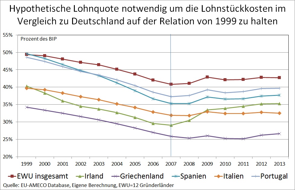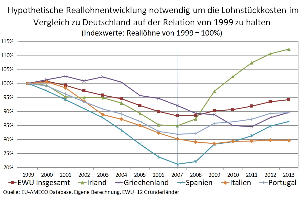 Die unterschiedlichen Inflationsraten erzeugten jedoch nicht nur unterschiedliche Verschuldungs- bzw. Sparanreize, sie führten auch zur Verschlechterung der preislichen Wettbewerbsfähigkeit der Krisenländer, welche ihrerseits die Leistungsbilanzungleichgewichte verstärkte. Wie hier schon einmal erläutert, hätten die jetzigen Krisenländer erhebliche Reallohn- bzw. Lohnquotensenkungen in Kauf nehmen müssen, um ihre Lohnstückkosten trotz höherer Inflationsraten auf dem Niveau von 1999 zu halten. Abbildung 5 zeigt die hypothetische Senkung von Reallohn und Lohnquote, die notwendig gewesen wäre, um trotz der höheren Inflation die Lohnstückkosten in Relation zu Deutschland auf dem Niveau von 1999 zu halten (Berechnung). Es ist nur schwer vorstellbar, dass eine solche geldpolitisch verursachte Umverteilung sozialpolitisch durchsetzbar wäre.