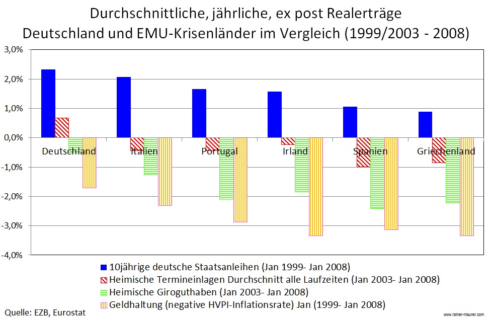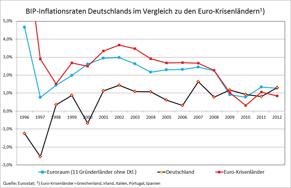 Fatal an dieser Entwicklung war, dass kein Mechanismus in Gang kam, der die wachsenden Ungleichgewichte stoppte. Im Gegenteil, es kam zunächst zu einer sich selbst verstärkenden Verschuldungsspirale: Da die Kredite, die aus Deutschland abflossen in den Empfängerländern zu einem erheblichen Teil für den Kauf „nichthandelbarer“ Güter und Dienstleistungen (z.B. Immobilien und Dienstleistungen des Bauhandwerks) verwendet wurden, resultierte dort stets eine Überschussnachfrage, die nicht durch Importe befriedigt werden konnte. In Deutschland kam es tendenziell zu einer Nachfragelücke, da ein Teil der Kredite nicht in Form von Exportnachfrage „zurückfloß“. Im Ergebnis verfestigten sich also die Inflationsdifferenzen und damit auch die Differenzen zwischen den Realzinsen.