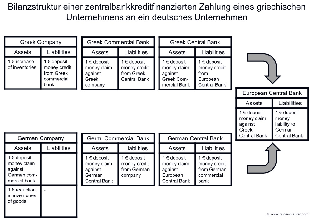 Es ist auch nicht so, dass Deutschland in einer „Target-Falle“ säße und erpressbar geworden wäre, weil es bei einem ungeordneten Auseinanderbrechen der Europäischen Währungsunion auf seinen Target-Forderungen gegenüber der EZB sitzen bleiben würde. Wenn tatsächlich ein Auseinanderbrechen der Währungsunion droht, können die deutschen Gläubiger vorher ihre Forderungen gegenüber der EZB in andere Aktiva umschichten. In diesem Fall verschwinden die Target-Forderungen. Das zeigt folgendes Beispiel: Ein griechisches Unternehmen erhält von einer griechischen Geschäftsbank einen Kredit in Höhe von 1 Euro, der von der griechischen Geschäftsbank aufgrund fehlender Marktreputation nur mit Hilfe eines Kredites der Europäischen Zentralbank finanziert werden kann. Wenn das griechische Unternehmen mit diesem Kredit einen Warenkauf bei einem deutschen Unternehmen bezahlt, ergibt sich folgende Verschuldungsstruktur (ausführliche Erläuterung hier):