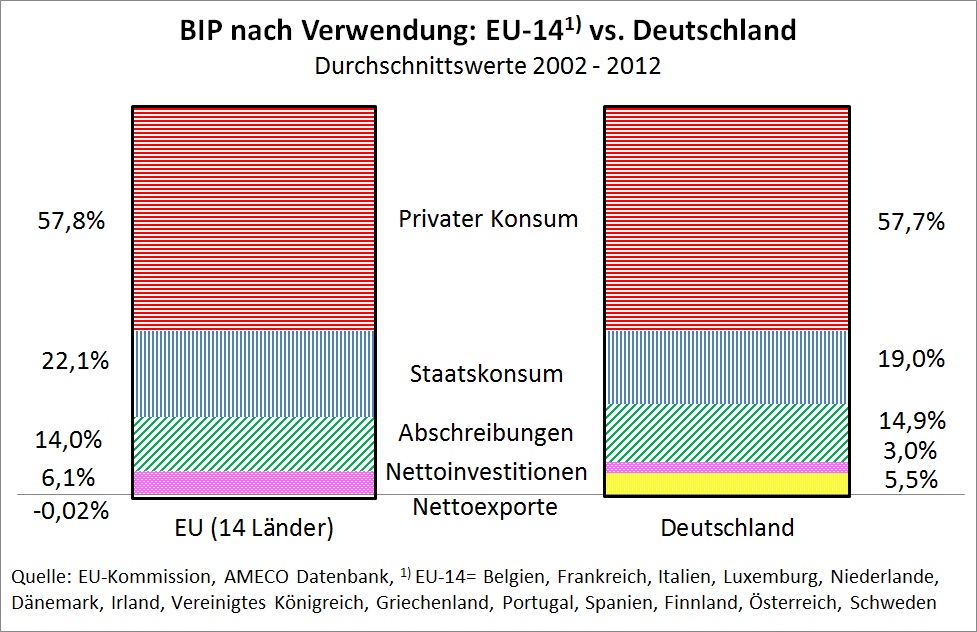 Niedrige Nettoinvestitionsquoten implizieren niedriges Kapitalstockwachstum, welches in der Regel zu einem niedrigerem Trendwachstum des Bruttoinlandsproduktes führt. Abbildung 3 zeigt, dass die niedrige deutsche Nettoinvestitionsquote im Vergleich zur EU-14 Ländergruppe nicht nur von einer demographisch bedingt niedrigen Wohnungsbauinvestitionsquote verursacht wird. Alle vier Hauptkomponenten der Nettoanlageinvestitionen (Berechnung) sind im Verhältnis zum Bruttoinlandsprodukt deutlich kleiner als im Durchschnitt der übrigen EU-14-Länder.