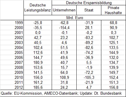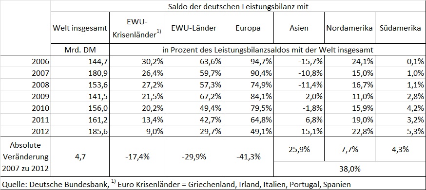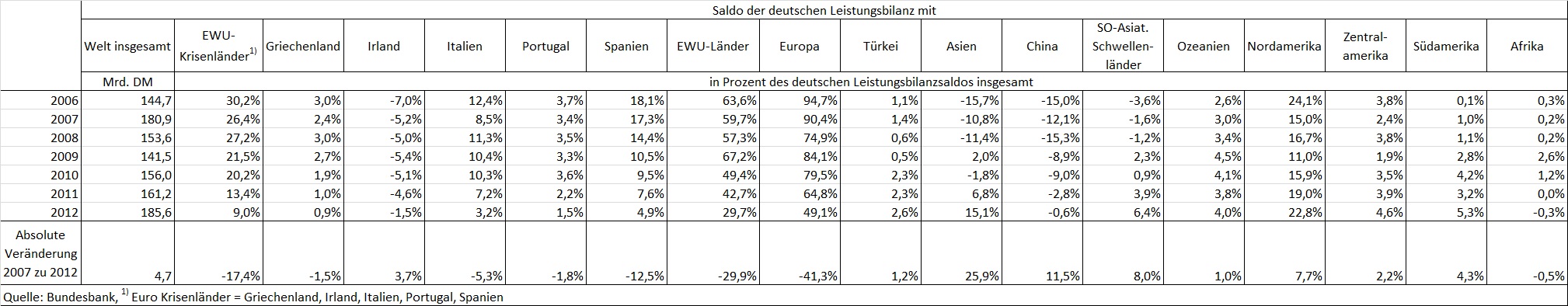 Dass deutsche Ersparnisse durch die Politik der EZB nach Südeuropa umgeleitet werden, ist also aus theoretischer Sicht also keineswegs so eindeutig, dass sich eine empirische Überprüfung der Hypothese erübrigt – zumal eine Überprüfung ja ganz einfach durch einen Blick auf die Leistungsbilanzzahlen der Deutschen Bundesbank erfolgen kann. Wie Abbildung 1 auf Basis dieser Daten zeigt, schrumpfte der deutsche Leistungbilanzüberschuss, der äquivalent zur Nettokreditgewährung gegenüber dem Ausland ist, mit dem Ausbruch der Subprimekrise von 180 Mrd. Euro im Jahr 2007 auf 140 Mrd. Euro im Jahr 2009 und stieg dann bis zum Jahr 2012 wieder auf 185 Mrd. Euro an. Diese Entwicklung ging allerdings mit einer dramatischen Umstrukturierung der einzelnen Ländersalden einher. Wie die Tabelle zeigt, sank in diesem Zeitraum der Überschuss gegenüber den Krisenländern von einem Anteil von 26% im Jahr 2007 auf einen Anteil von nur noch 9% im Jahr 2012 (Ergebnisse für einzelne Länder finden sich hier hier). Insgesamt ging in die Mitgliedsländer der Europäischen Währungsunion im Jahr 2007 noch ein Anteil von 60% des deutschen Leistungsbilanzüberschusses. Bis zum Jahr 2012 hat sich dieser auf 30% dezimiert. Im Gegenzug dazu stieg der Anteil der übrigen Welt am deutschen Leistungsbilanzsaldo – insbesondere der Asiens – massiv an, wie die Tabelle zeigt.