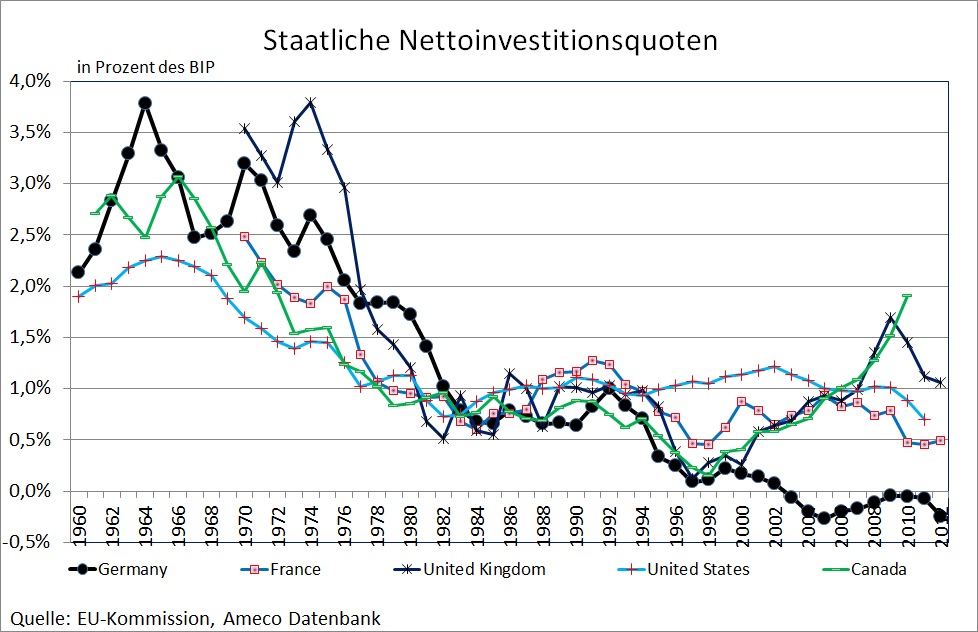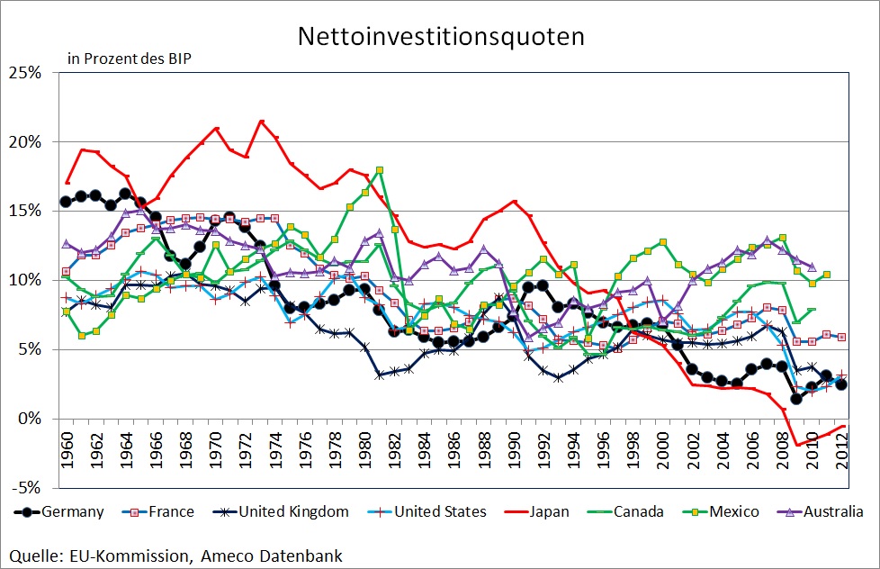 Das birgt natürlich Probleme: Zum einen spricht einiges dafür, dass auf den Vermögensmärkten vieler Schwellenländer Spekulationsblasen entstanden sind, die bei einer Kursänderung der US-amerikanischen Geldpolitik platzen könnten (Rey (2013)). Die deutschen Ersparnisse, die derzeit in diese Länder fließen, sind also ähnlichen Risiken ausgesetzt, wie die deutschen Ersparnisse, die im vergangen Jahrzehnt in die jetzigen Euro-Krisenländer geflossen sind. Zum anderen, hat Sinn Recht, wenn er darauf verweist, dass die Ersparnis, die in Form von Leistungsbilanzüberschüssen ins Ausland fließt, nicht mehr für inländische Investitionen zur Verfügung steht. Wie Abbildung 2 zeigt, geht der deutsche Leistungsbilanzüberschuss mit inländischen Nettoinvestititionsquoten einher, die im internationalen Vergleich niedrig sind. Das gilt für die Nettoinvestitionsquote insgesamt, aber auch für die staatliche Nettoinvestitionsquote (die leider nur für einen Teil der Länder auf der Ameco-Datenbank der EU-Kommission vorliegt). Letztere war in Deutschland im vergangenen Jahrzehnt sehr häufig sogar negativ.
