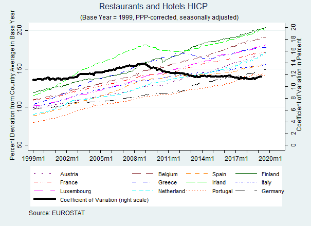 As the last two diagrams of Figure 3 display, the service sector components of the HICP are quite heterogenous. Despite the fact that services of restaurants and hotels are locally produced, labor-intensive and not internationally tradeable, the dispersion of prices of restaurant and hotel services is significantly smaller than for “total services”. One explanation might be that restaurant and hotel services offered at different tourist locations are, from the perspective of consumers, relatively close substitutes. New price comparison tools, like online booking apps, may have helped to create a relative competitive international market for such services.