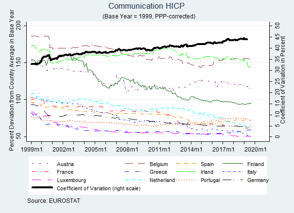 The opposite situation seems to be prevalent on the market for “communication” services. Even though modern communication services rely on the same capital-intensive technology, the prices for these services differ largely between the EMU-founding member states and the divergence has been steadily growing over the sample period. This indicates that local markets in some countries might be dominated by quite narrow national oligopolies, which exert a strong market power.