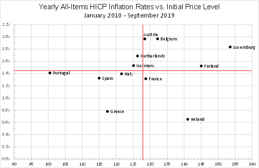 Legend Figure 2: The horizontal lines mark the average inflation rate over the 12 EMU-founder states over the corresponding time range, January 1999 – January 2010 and January 2010 – September 2019. The vertical lines mark the average HICP level rate over all EMU-founder states in the corresponding starting period, January 1999 and January 2010. Source: EUROSTAT