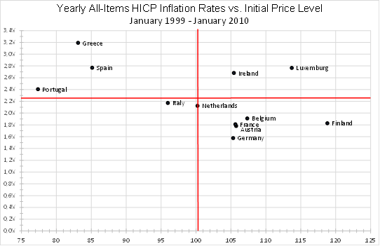 But whatever the explanation for the observed divergence of prices is, the problems for monetary policy in the EMU will remain. Under the observed empirical conditions, it cannot be expected that market forces spread the target inflation rate of the ECB evenly across the member states. This questions the European Central’s Bank’s principle of a “single monetary policy“. As mentioned in the introduction diverging inflation rates might cause self-enforcing inflationary spirals with a corresponding worsening of the competitiveness of a country.