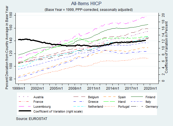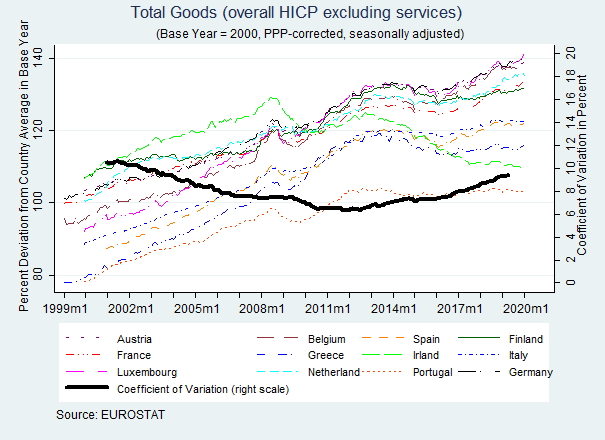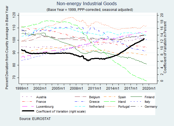 The HICP database of the statistical office of the European Union (Eurostat (2020a)) offers also data for “non-energy industrial durable goods”, which are strictly speaking not a HICP component. This aggregate includes machinery, manufacturing plants and raw materials with exception of energy used by industries or firms. These goods are typically also not sold by local retail chains but by producers themselves or international intermediaries. Hence the market structure should be quite different from that of “clothing” or “non-alcoholic beverages”. However, as the corresponding diagram in Figure 3 shows, the divergence of price levels is strong and has been significantly growing after a period of slight reduction that ended in the year 2013.