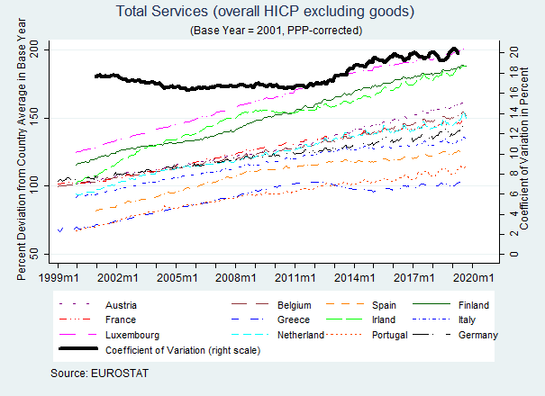 Theoretical intuition might tell that the divergence of the overall HICP price level has been mainly caused by the fact that a large part of HICP components are service-sector goods and as such non-tradables. A closer look to the disaggregated components of the HICP shows (Figure 3), however, that this intuition is wrong. While the coefficient of variation is roughly half as large for the total goods HICP component as for the total service component, a similar trend reversal is recognizable for both components. Consequently, the component of the HICP, which should mostly include tradeable goods is also not characterized by a long-run convergence of prices driven by arbitrage.