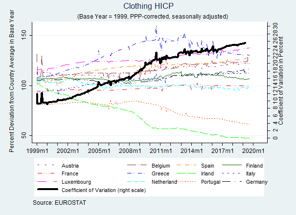 Figure 3 also reveals, that reducing the aggregation level further to the 3-digit level does not necessarily lead to more convergence. The HICP component “clothing” includes such items as clothing materials, garments, accessories and repair of clothing. Clothing is typically produced outside of Europe in emerging market countries. So the purchase prices for clothing should be similar for all European countries. Nevertheless, the retail prices as measured by the HICP differ widely: Prices in Ireland are roughly 80 percent below the price levels in Luxemburg or Greece at the end of the sample period. Omitting “outliers”, such as Ireland, Portugal and Greece, significantly reduces the level and the slope of the coefficient of variation, but does not eliminate its overall positive trend.