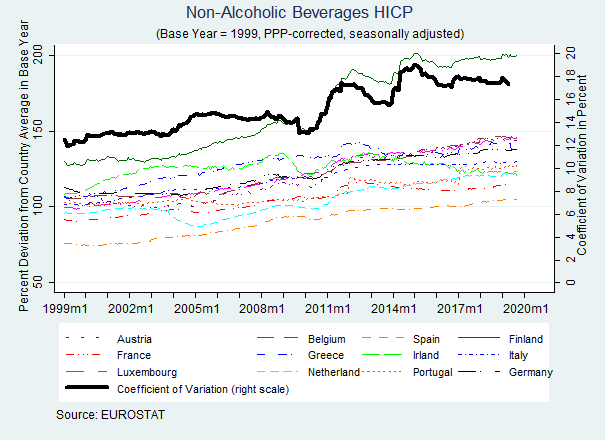 The HICP component “non-alcoholic beverages” includes such items as fruit and vegetable juices, coffee, tea, cocoa drinks, water, and soft drinks. They should be typically more tradeable as more perishable food items and less suffer from different tax regimes as “alcoholic beverages”. Nevertheless, large differences in price levels continue to persist as Figure 3 shows. Even omitting the “outlier” Finland leaves a price difference between Spain and Austria of roughly 40 percent. As Appendix Figure 2 shows, the coefficient of variation without Finland has been roughly constant. Until the year 2005 the coefficient increased, followed by a decline until the year 2014. Since then it is slightly growing again.