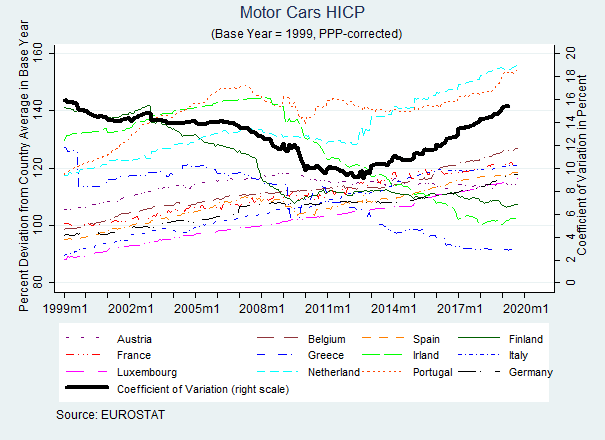 Motor cars are a HICP component, which are typically distributed by dealership networks franchised by car producers. However, a so called “gray market” exists also, where non-franchised dealers try to profit from international price differences. On the 3-digit level the HICP component “motor cars” includes “new motor cars” as well as “second-hand motor cars”. Since the second-hand market is less controlled by car producers, more competition and arbitrage activities should be possible. However, as the corresponding diagram of Figure 2 shows, price levels for motor cars still widely differ across the founding EMU-member states and the coefficient of variation has returned to its initial level after a decrease that took place until the year 2013.