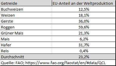 Sehr fragwürdig ist also auf jeden Fall die bisherige Extensivierungsstrategie der EU-Kommission, die lediglich auf die direkte Biodiversitätswirkung auf der bewirtschafteten Fläche abzielt und die indirekte Biodiversitätswirkung über den Flächenbedarf vernachlässigt. Der Anteil der EU-Getreideproduktion an der Weltproduktion liegt beim Weizen derzeit bei 18%, bei der Gerste bei 36% und beim Roggen bei fast 60% (FAO Daten). Wenn die EU durch die beschriebenen Extensivierungsmaßnahmen ihren Beitrag zur Weltgetreideproduktion reduziert, wird dies auf den global vernetzten Weltagrarmärkten zu Preissteigerungen führen, die starke Anreize zur Ausweitung landwirtschaftlicher Produktionsflächen außerhalb der EU setzen werden. Der damit einhergehende Habitatverlust wird zu einem Rückgang der Biodiversität außerhalb der EU führen. Es besteht also ein globaler Zielkonflikt zwischen der Biodiversität in der EU und der Biodiversität außerhalb der EU, dessen sich die EU-Agrarpolitik bewusst sein sollte.