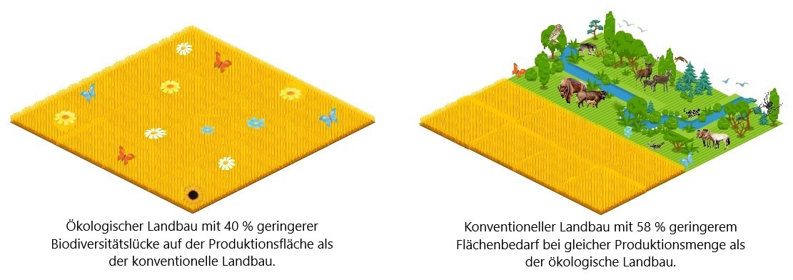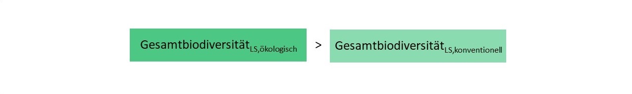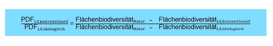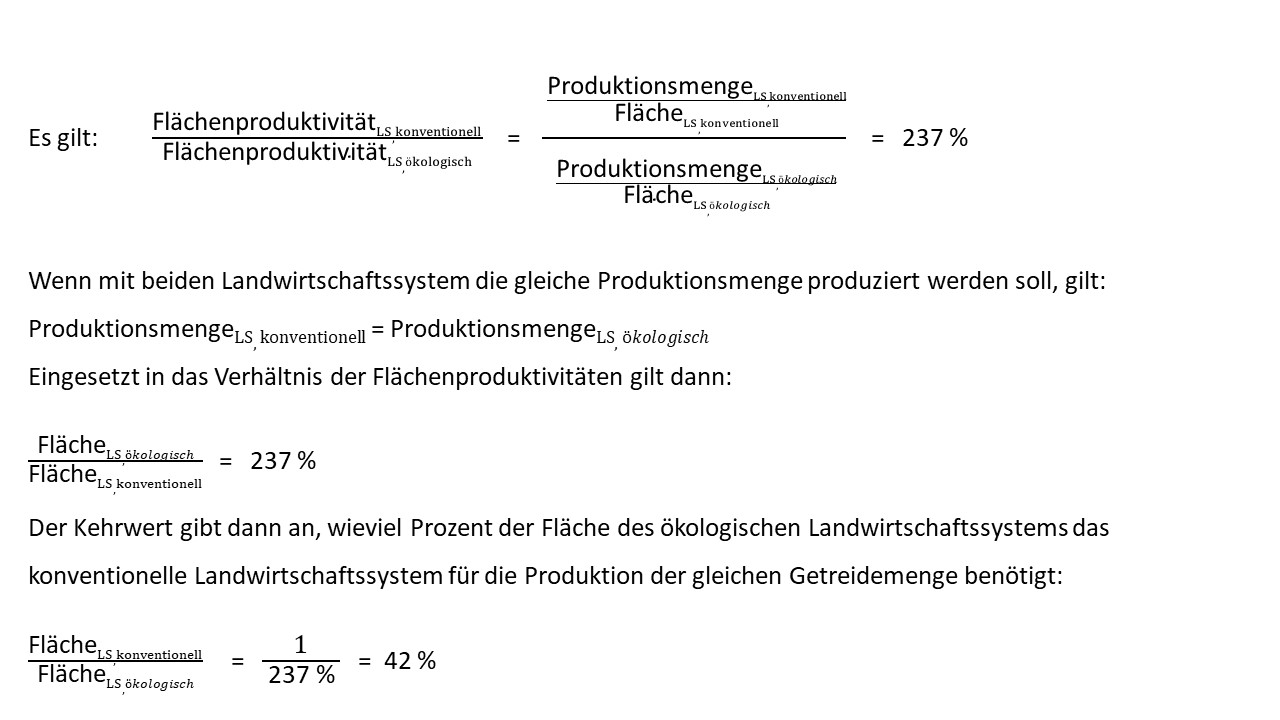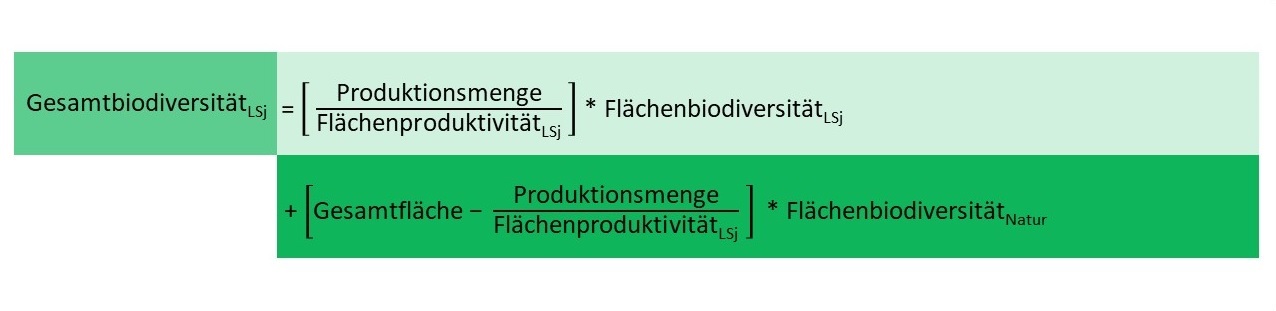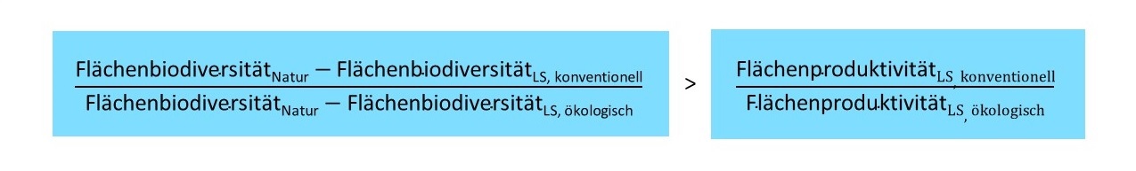 Die zur Herstellung der gewünschten Produktionsmenge benötigte Fläche entspricht dabei der Produktionsmenge dividiert durch die Flächenproduktivität des jeweiligen Landwirtschaftssystems. Die auf der Agrarfläche herrschende Biodiversität entspricht dem Produkt aus Agrarfläche und der für das jeweilige Landwirtschaftssystem charakteristischen Biodiversität je Flächeneinheit. Die ungenutzten Naturflächen ergeben sich aus der Differenz zwischen der Gesamtfläche und der benötigten Agrarfläche. Die darauf herrschende Biodiversität ergibt sich durch Multiplikation der Größe der Naturfläche mit der in freier Natur vorherrschenden Biodiversität je Flächeneinheit. Setzt man nun in diese Formel beispielsweise die für das Landwirtschaftssystem „ökologischer Landbau“ und die für das Landwirtschaftssystem „konventioneller Landbau“ charakteristischen Werte ein, lässt sich eindeutig bestimmen, welches Landwirtschaftssystem insgesamt mehr Biodiversität ermöglicht. Wie man durch Einsetzen der obigen Formel zeigen kann, ermöglicht der ökologische Landbau dann eine größere Biodiversität als der konventionelle Landbau