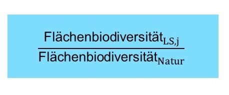 Die Größe der ungenutzten Naturflächen entspricht der Gesamtfläche des Landes minus der Agrarflächen. Andere Flächen, wie Siedlungs-, Industrie- oder Infrastrukturflächen, können dabei vernachlässigt werden, wenn zur Vereinfachung zunächst unterstellt wird, dass die Wahl des Landwirtschaftssystems keinen gravierenden Einfluss auf die Biodiversität dieser Flächen hat. Durch Faktorisierung der relevanten Einflussgrößen, kann die Gesamtbiodiversität dann wie folgt in Abhängigkeit von der gewünschten Produktionsmenge dargestellt werden: