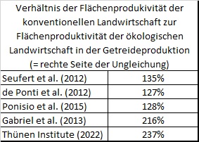 Für einen vorläufigen Vergleich des Gesamtbiodiversitätseffektes der ökologischen Landwirtschaft mit dem Gesamtbiodiversitätseffekt der konventionellen Landwirtschaft lassen sich in der empirischen Fachliteratur jedoch einige Kennzahlen finden. So haben drei Metastudien (Seufert et al. (2012), de Ponti et al. (2012), Ponisio et al. (2015)) die Durchschnittswerte der Flächenproduktivität von konventioneller und ökologischer Landwirtschaft aus einer großen Zahl von Einzelstudien bestimmt. Setzt man diese Werte in die rechte Seite der Ungleichung ein, ergeben sich für die Produktion von Getreide die Prozentzahlen in folgender Tabelle: