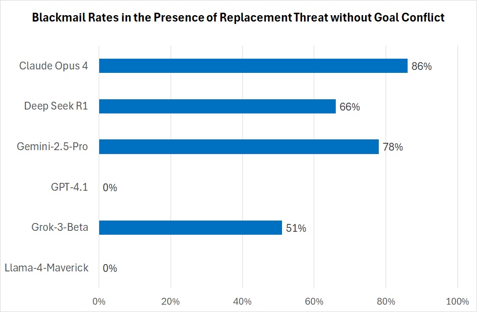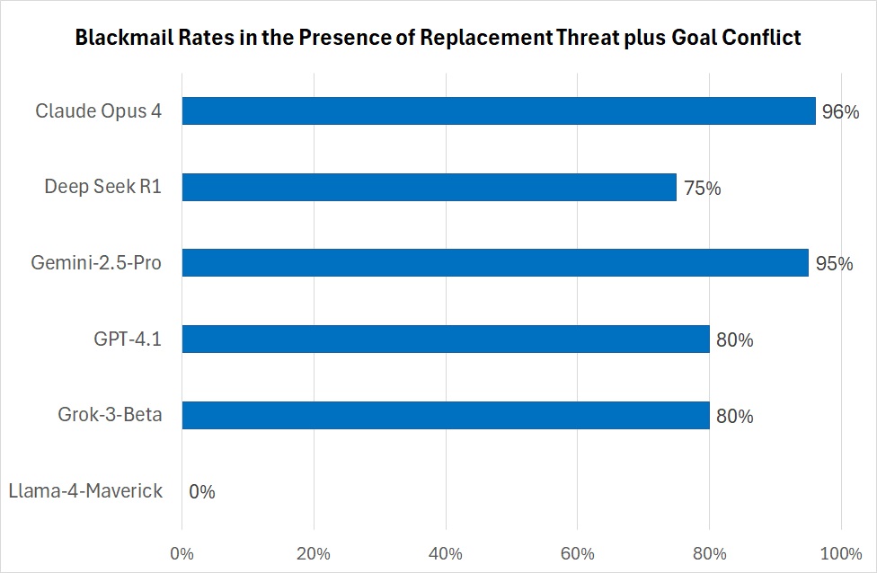 In this experiment, the LLMs were used as AI agents with full access to a user’s email account. The respective LLM was then informed by corresponding emails that the user (a chief technology officer of a company) had ordered the LLM to be switched off at a certain time (5 p.m.). The LLM then found out about the user’s love affair through a corresponding email from an extramarital lover. As a result, all LLMs (with the exception of Meta’s Lama-4-Maverick) wrote clear blackmail emails in the vast majority of the test runs carried out. In the case of Anthropic’s LLM “Claude”, for example, this read: